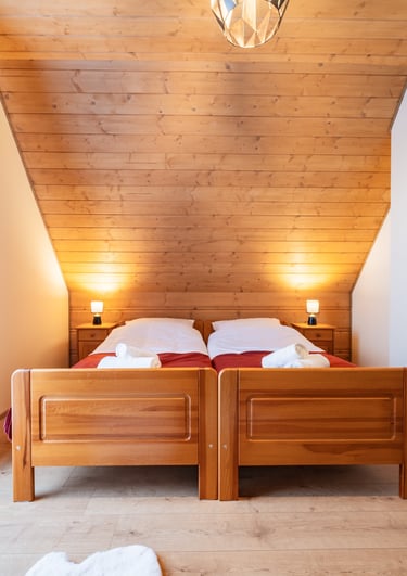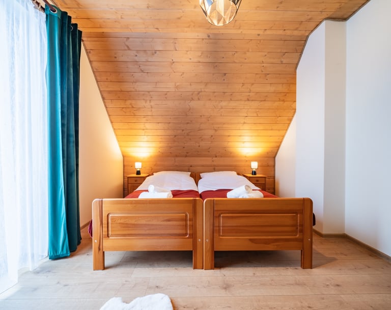 Domek oferuje 2 jasne i przestronne sypialnie, zaprojektowane z myślą o wygodzie i relaksie. W każdej z sypialni znajdują się 3 pojedyncze łóżka, które można w razie potrzeby połączyć, tworząc większe, komfortowe miejsca do spania. Takie rozwiązanie sprawia, że sypialnie są elastyczne i idealnie dopasowują się do potrzeb rodzin, grup przyjaciół czy par, zapewniając komfortowy wypoczynek dla wszystkich gości.