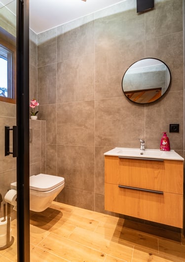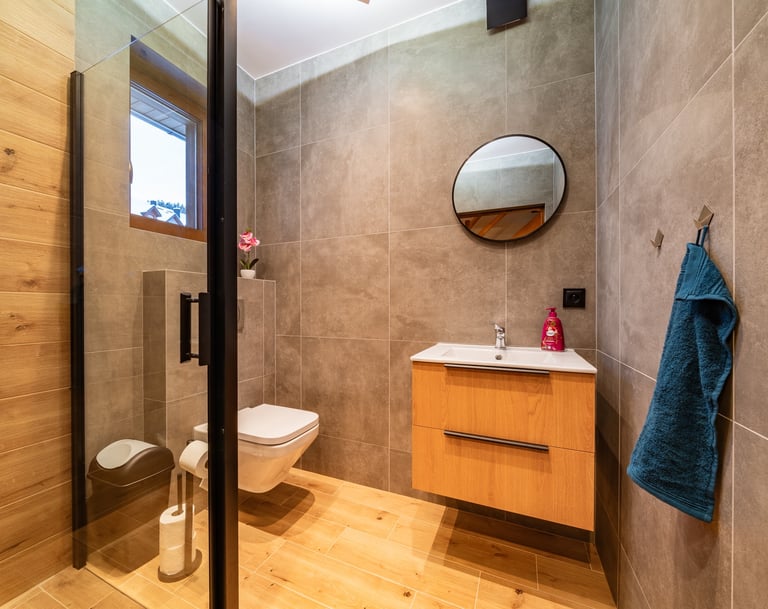 Domek posiada przestronną, nowocześnie urządzoną łazienkę z wygodnym prysznicem, zapewniającą komfort codziennego użytkowania. Dodatkowo w domku znajduje się oddzielna toaleta, co zwiększa wygodę pobytu, szczególnie przy większej liczbie gości. Takie rozwiązanie sprawia, że każdy może korzystać z łazienki i toalety bez kolejek, a cały dom pozostaje funkcjonalny i praktyczny dla rodzin i grup przyjaciół.