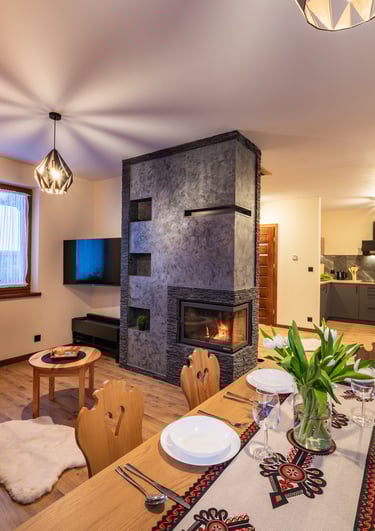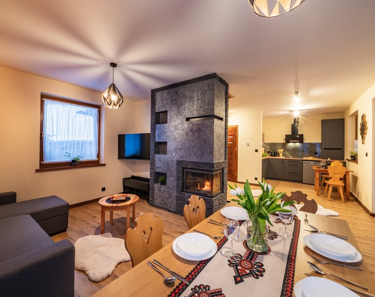 Nasz domek został zaprojektowany tak, aby zapewnić maksymalny komfort i przestrzeń do wspólnego wypoczynku. Salon płynnie łączy się z w pełni wyposażoną kuchnią, tworząc jasne i przyjemne wnętrze idealne dla rodzin i par. Centralnym punktem jest kominek opalany drewnem, który nadaje pomieszczeniu ciepła i wyjątkowego klimatu. Rozkładana sofa pozwala wygodnie przenocować dwie dodatkowe osoby. Stół z krzesłami sprzyja wspólnym posiłkom i rozmowom, a duże okna tarasowe doświetlają wnętrze i otwierają je na otaczającą naturę.
