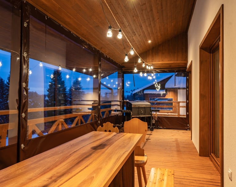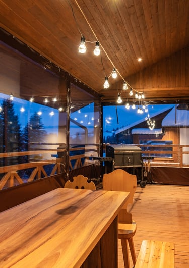 Domek posiada duży i w pełni zadaszony taras, który zapewnia komfortowy wypoczynek na świeżym powietrzu niezależnie od pogody. To idealne miejsce na poranną kawę, wspólne posiłki czy wieczorne rozmowy. Na tarasie znajduje się również grill, dzięki czemu goście mogą przygotować ulubione potrawy na świeżym powietrzu. Przestrzeń mieści zarówno wygodne meble wypoczynkowe, jak i stół z krzesłami, tworząc przytulną strefę relaksu będącą naturalnym przedłużeniem salonu.